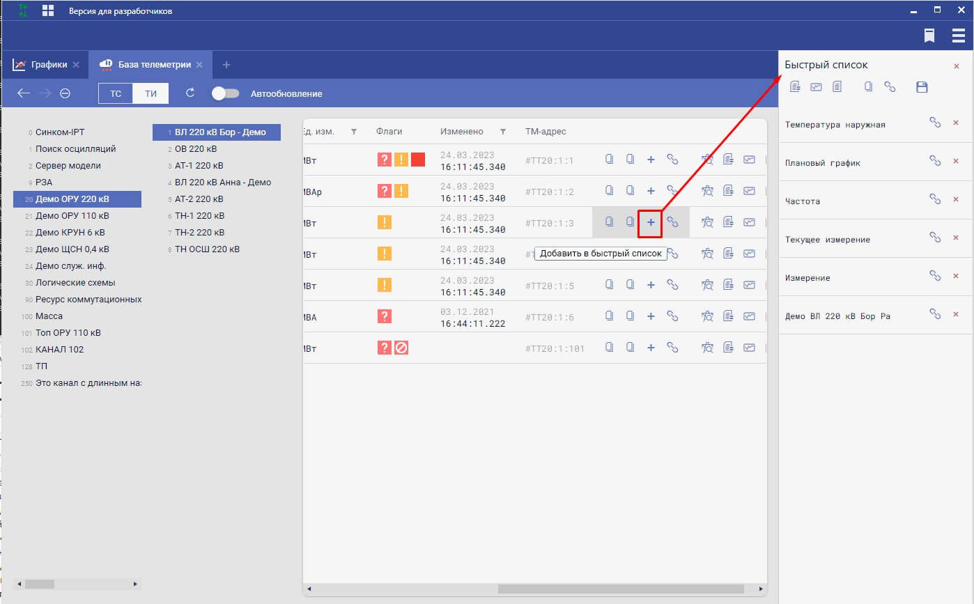 Функционал быстрых списков позволяет пользователю сформировать легкодоступный список сигналов и измерений из множества страниц Клиента (схемы, SVG, база телеметрии и т.д.).