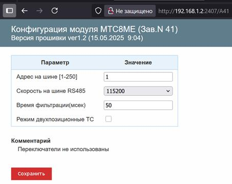 Для конфигурирования МТС8МЕ должен быть подключен по интерфейсу RS-485 к Синкому-Д или другому преобразователю TCP/IP->RS-485. Подключение к конфигуратору происходит с помощью WEB-браузера путем ввода в адресной строке команды типа: «192.168.1.2:2407» , где: