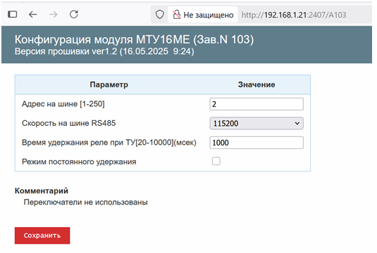 Для конфигурирования по WEB-интерфейсу МТУ16МЕ должен быть подключен к Синкому-Д или другому преобразователю TCP/IP->RS-485. Подключение к конфигуратору происходит с помощью WEB-браузера путем ввода в адресной строке команды типа: