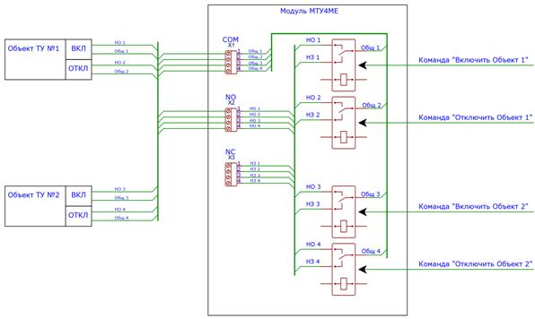Подключение объектов ТУ производится в соответствии с алгоритмом работы конкретного объекта телеуправления. При этом могут быть задействованы как НО, так и НЗ контакты выходных разъемов. На рисунке 7 показано подключение двух объектов ТУ с применением НО контактов.