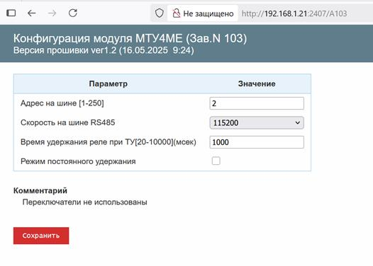 Для конфигурирования по WEB-интерфейсу МТУ4МЕ должен быть подключен к Синкому-Д или другому преобразователю TCP/IP->RS-485. Подключение к конфигуратору происходит с помощью WEB-браузера путем ввода в адресной строке команды типа: «192.168.1.21:2407» , где: