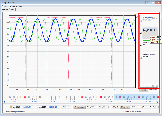 Каждый график в окне просмотра имеет свой цвет. Выделенный график отображается жирной линией с подсвеченными точками значений из архива. При наведении ЛКМ на узел графика всплывает подсказка, содержащая информацию: время, дата, значение, достоверность.