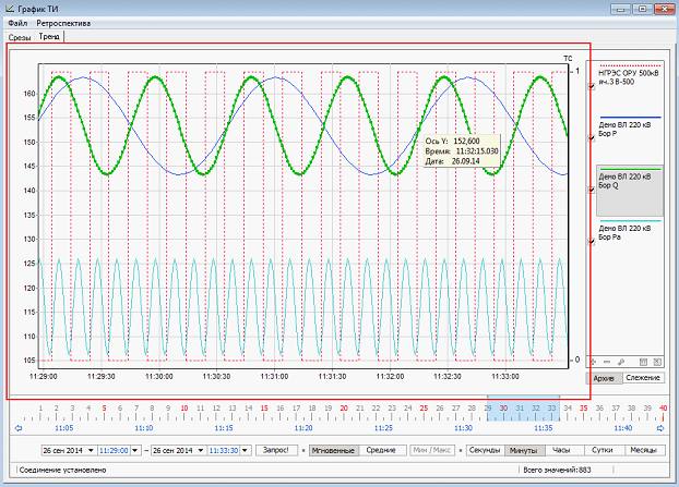 Режим «Слежение» предназначен для отображения графиков телепараметров в режиме реального времени. При этом автоматическое перестроение графика (сдвиг шкалы времени и обновление данных) происходит в темпе обновления данных на источнике. В данном режиме на панели управления доступна для изменения только шкала времени.