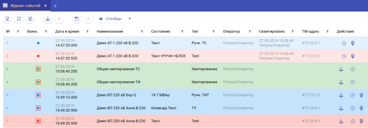 По умолчанию журнал событий отображает информационные столбцы: №, Важность, Дата и время, Наименование, Состояние, ТИП, Оператор, Скивтировано, ТМ-адрес, Действия. К отображению столбцов возможно применить индивидуальные пользовательские настройки, такие как:
