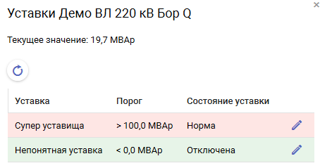 Открывает окно используемых для выбранного телеизмерения уставок.