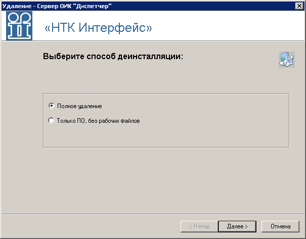Удаление ПО контроля и управления «ОИК Диспетчер НТ»;