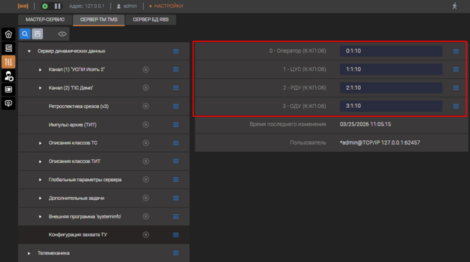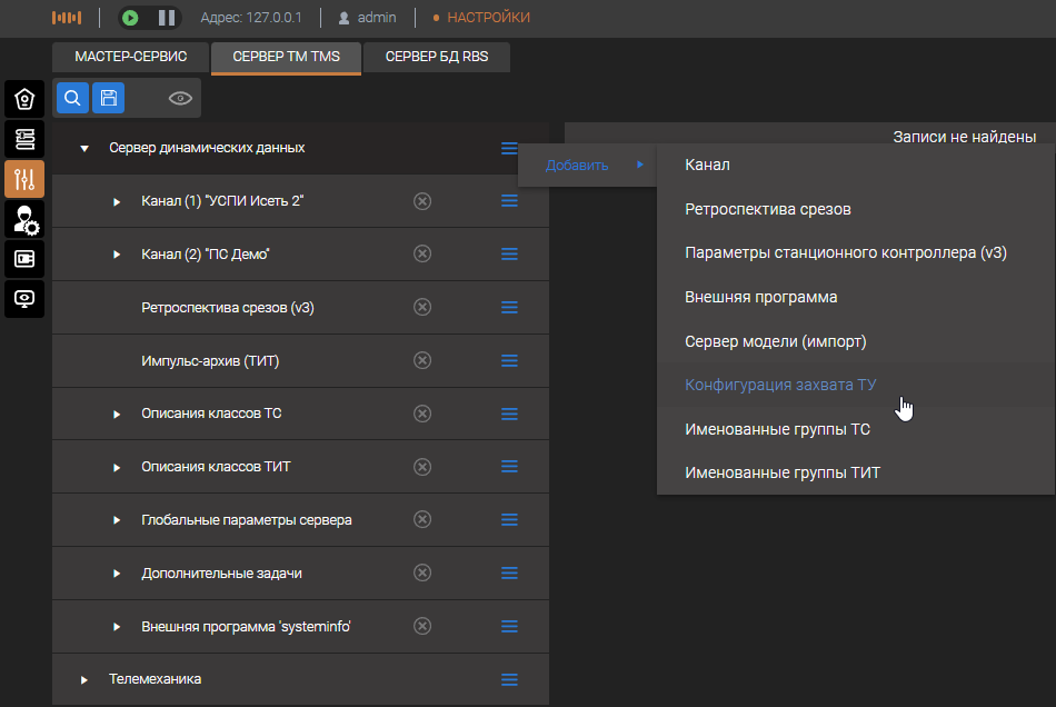 В появившемся окне настройки необходимо заполнить адреса телесигналов из структуры сервера, к которым привязано телеуправления в настроенных каналах связи.