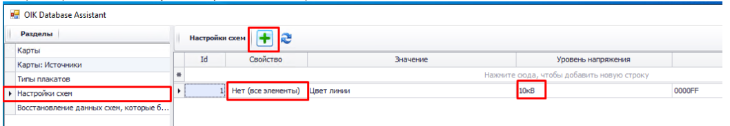 В открывшемся окне приложения выбрать раздел «Настройки схем» — нажать значок + чтобы добавить новую строку. Обязательно задать id строки (любое число), обязательно задать свойство (для цветов необходимо использовать «Нет (все элементы)», заполнить поле значение (произвольное слово), заполнить уровень напряжения (10кВ, 110кВ и.т.д пишется слитно как в редакторе Модус), задать необходимый Вам цвет в коде RGB.