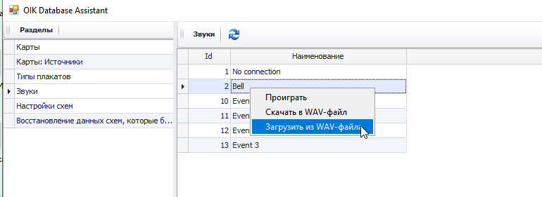 Необходимо выбрать раздел "Звуки", в котором будут доступны все используемые ПО Клиент10 звуковые файлы. Нажав правой кнопкой мыши на необходимый звук можно его проиграть, скачать в отдельный файл или загрузить новый.