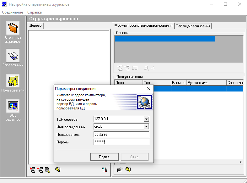 В появившемся окне ввести строки подключения к серверу (заполняется так же как на ПО Клиент10 при подключении).