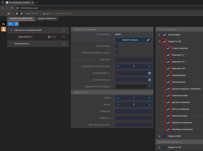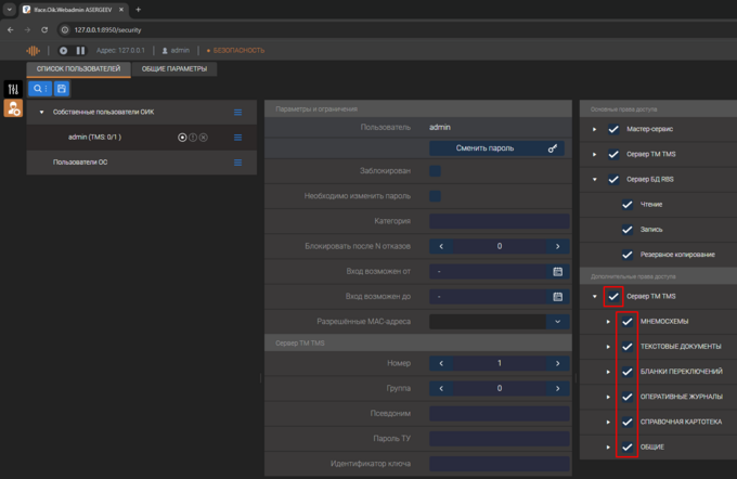 Редактирование дополнительных прав безопасности TMS-сервера ПО «ОИК Диспетчер НТ».