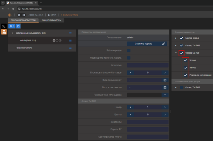 После перехода в раздел "Безопасность" необходимо предоставить соответствующие права доступа пользователю admin на уровнях: Master-сервис/Конфигуратор (доступ к ПО сервера), TMS и RBS-серверов. После изменения прав необходимо нажать кнопку «Сохранить»