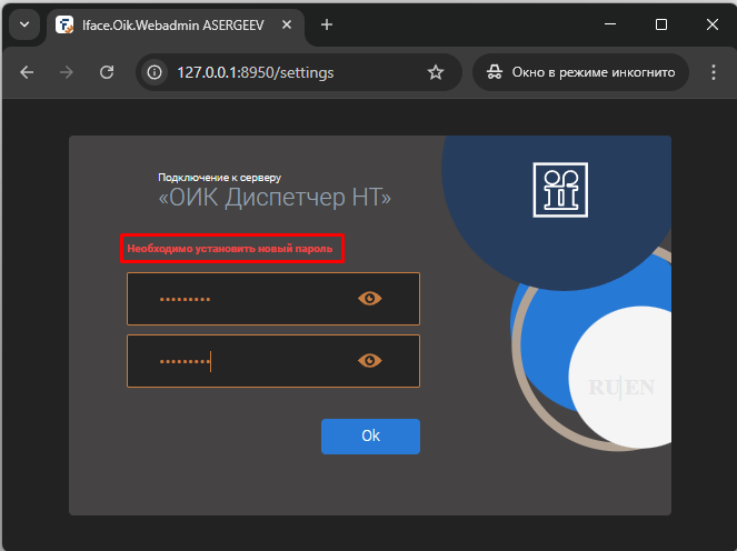 После первой авторизации появится окно с предупреждением о необходимости смены пароля. Процедуру смены пароля необходимо произвести обязательно. По умолчанию в комплексе установлена жесткая парольная политика (подробное описание доступно в