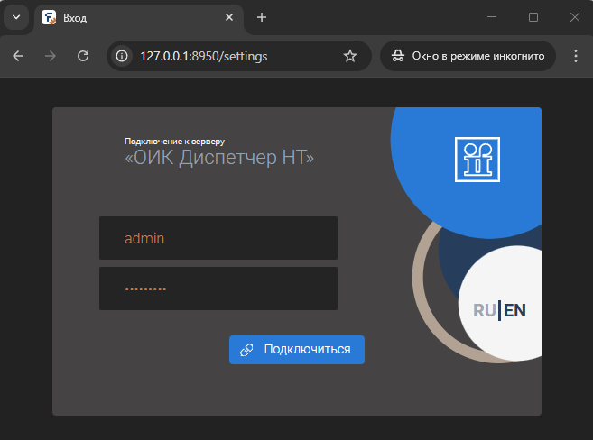 После установки ПО сервера «ОИК Диспетчер НТ» версии 3.Х. необходимо подключиться к ядру сервера с помощью модуля Веб-администрирования, который доступен в виде web-страницы по адресу: http://localhost:8950/(при локальном подключении), либо можно указать IP-адрес компьютера на котором установлено ПО сервера, например: http://11.198.14.13:8950/(где 11.198.14.13 IP-адрес компьютера на котором установлено ядро сервера).