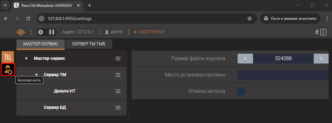 После успешного входа откроется главное окно модуля администрирования. Для получения доступа к функционалу сервера необходимо наделить учетную запись правами доустпа. в появившемся окне необходимо перейти в раздел «Безопасность» нажав на иконку