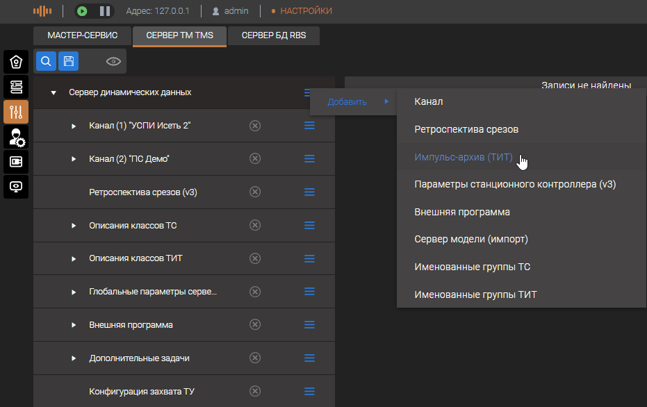Для добавления классов функции импульс-архива, необходимо открыть страницу меню "Настройка" выбрать пункт "Сервер динамических данных" - нажать кнопку - "Добавить" - "Импульс-архив(ТИТ(".