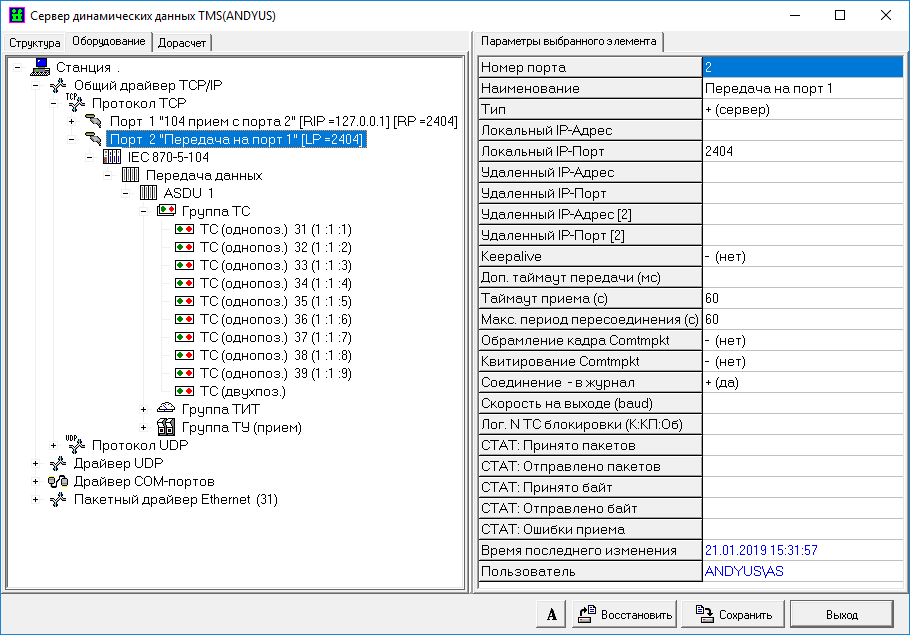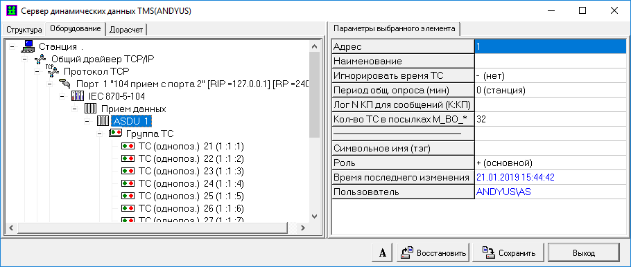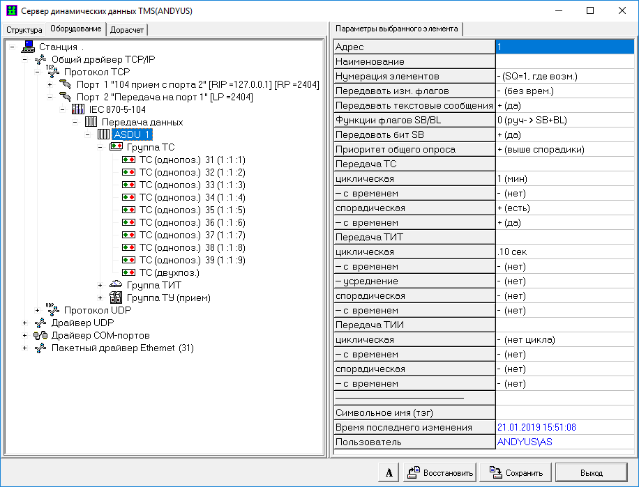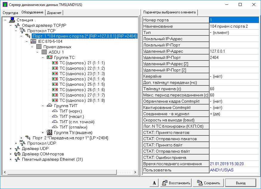 Настройка сервера TMS (прием ‘от себя’, МЭК 870-5-104, см. раздел 18.3.1)