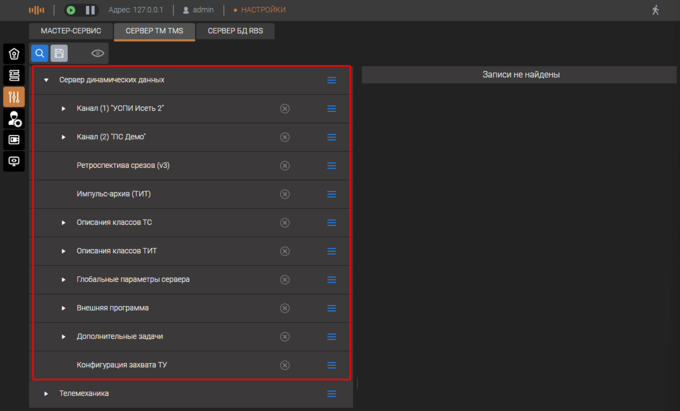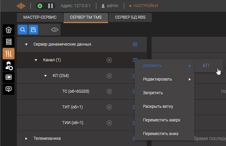 Для добавления настроек необходимо на уровне "Сервер динамических данных" нажать на кнопку