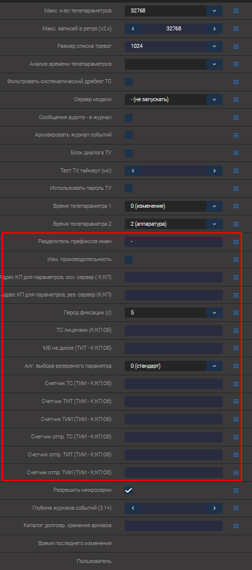 Отображение дополнительных настроек компонентов. Некоторые уровни настроек имеют скрытые или диагностические настройки, которые необходимы только при детальном анализе состояния установки. Например глобальные параметры сервера, с включенным признаком отображения, показывают дополнительные пункты настройки