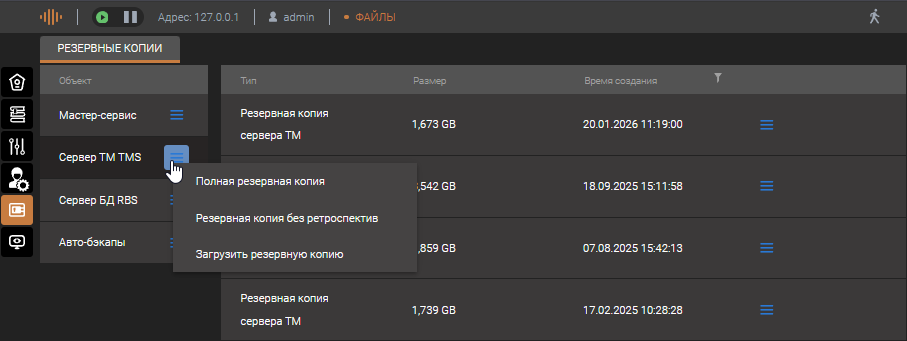 При настройке сервера динамических данных предусмотрена возможность «отката» к конфигурации, которая была перед последним её сохранением. Для этого необходимо перейти в пункт "Файлы" и восстановить бэкап ТМС-сервера соответствующий по времени предыдущим настройкам.