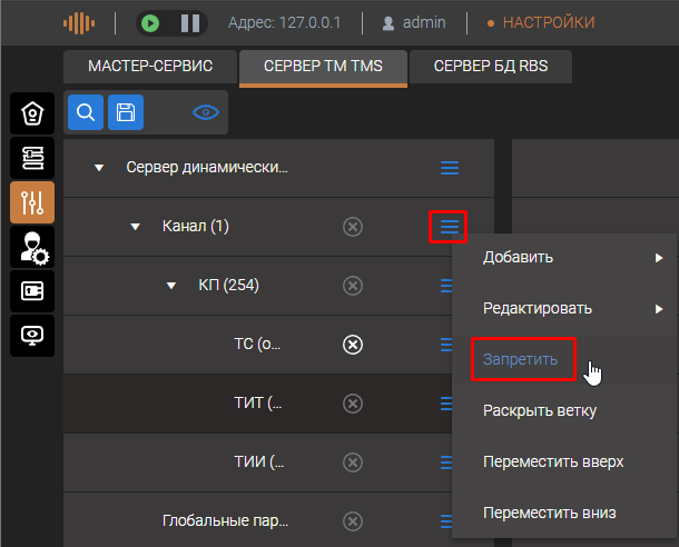 Любой компонент структуры сервера динамических данных может быть временно заблокирован. Для этого следует выбрать блокируемый компонент, активировать контекстное меню и выбрать строку меню «Запретить». Запрещенный компонент помечается символом