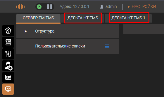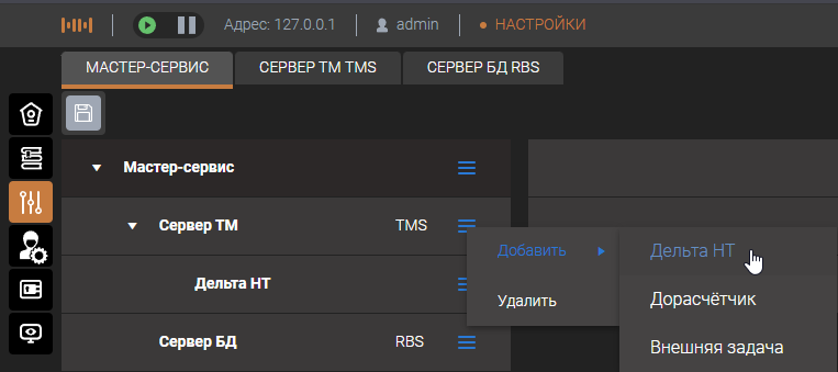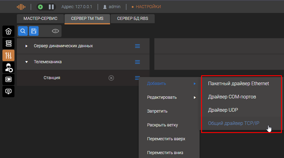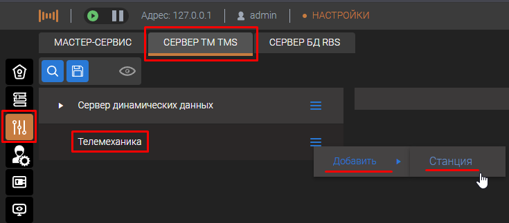 Для перехода к настройке нужно перейти на вкладку "Сервер ТМ TMS" и выбрать доступный пункт "Телемеханика". Описание текущего компьютера (на котором установлено ПО) начинается с добавления компонента "Станция".