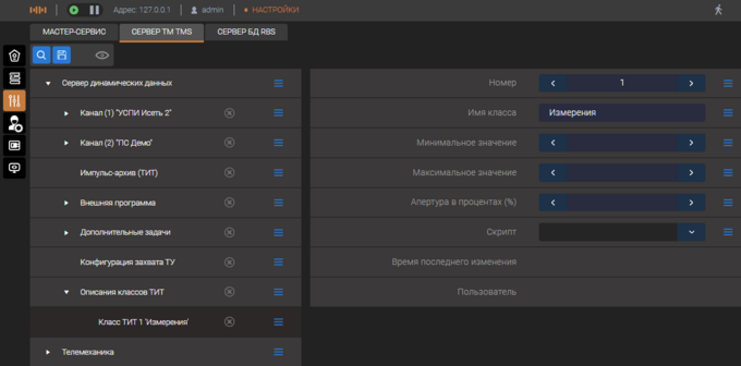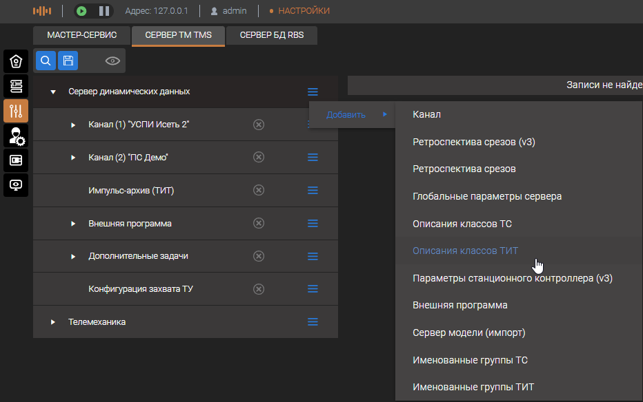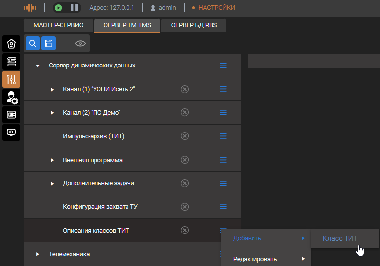 Для добавления классов ТИТ, необходимо открыть страницу меню "Настройка" выбрать пункт "Сервер динамических данных" - нажать кнопку - "Добавить" - "Описание классов ТИТ".