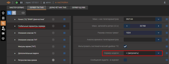 В версиях от марта 2023 года для работы модуля достаточно выполнения единственной настройки: выбрать пункт «Глобальные параметры сервера» (если данный пункт отсутствует, его нужно создать аналогично новому каналу, щелчком правой кнопкой мыши по пустому полю, «Добавить один», «Глобальные параметры сервера»). В параметрах следует найти опцию «Сервер модели» и выбрать значение «запускать». После этого следует сохранить настройки и перезапустить сервер (до перезапуска изменения не будут активны).
