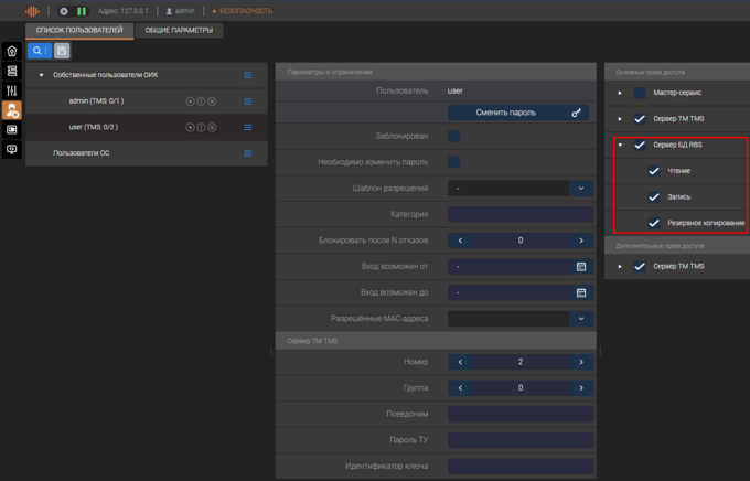 - Запись. Ограничивает возможность записи данных в RBS-сервер: сохранение схем при использовании старого клиентского приложения, сохранение документов, настроек панелей виджетов, настроек пользователя при использовании ПО Клиент10.
