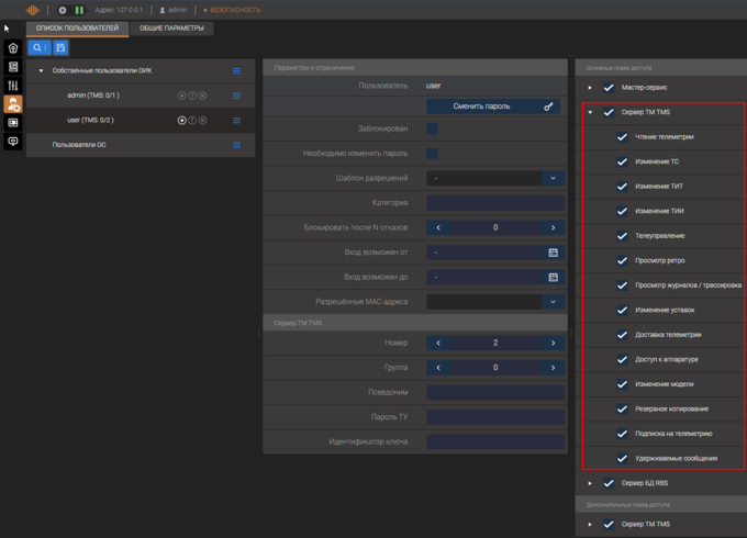 - Доступ к аппаратуре (квитирование диспетчерского щита, запрос на обновление телеметрии, для квитирования необходимо при настройке сервера статических данных пользователю разрешить телеуправление)