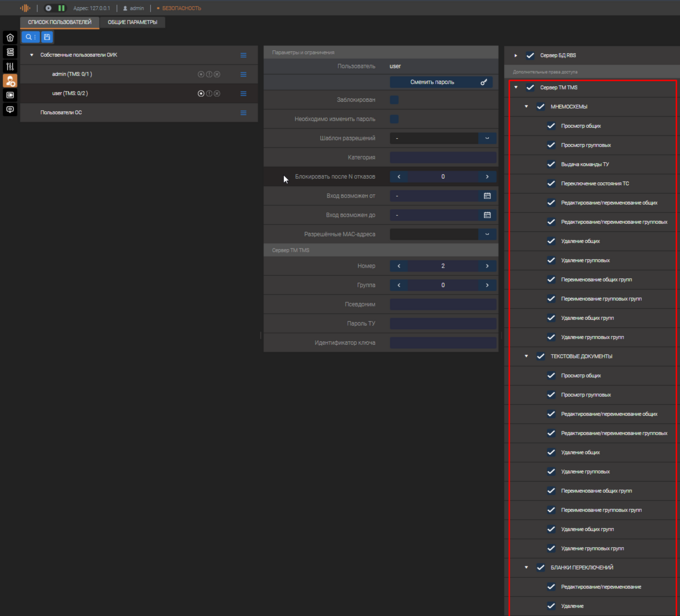 - Телеуправление (для пользователей это право должно быть разрешено на уровне сервера динамических данных, а также при настройке пользователей сервера статических данных)