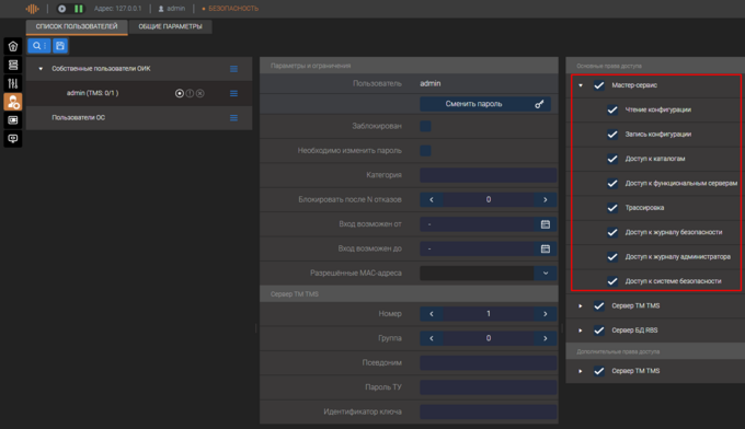 - Доступ к функциональным серверам (в ранних версиях "Доступ к серверам"). Ограничивает возможность остановки/запуска сервера, доступ к просмотру окон ТМС-монитора, Дельта-монитора.