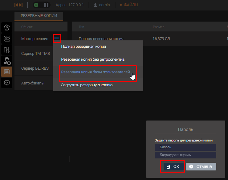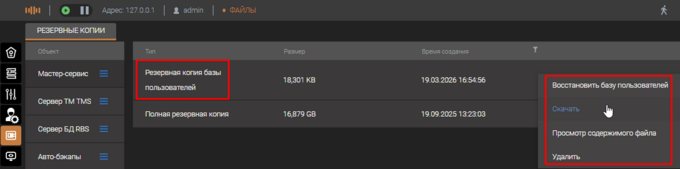 Для получения бинарной копии базы данных пользователей необходимо выбрать пункт «Файлы» и на уровне Мастер-сервис выбрать пункт полной резервной копии. В созданный файл войдет бинарная копия базы пользователей.