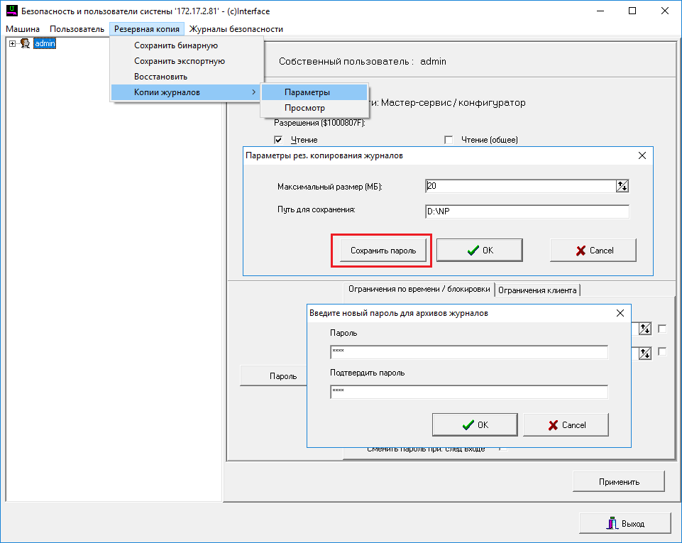 Сохранить пароль. При нажатии на данную кнопку вызывается окно ввода пароля. Указанный пароль необходимо будет вводить при попытке просмотра резервных файлов.