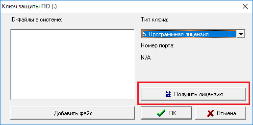 - В появившемся окне выбрать параметр «Тип ключа» - «5. Программная лицензия», после нажать на кнопку «Получить лицензию».