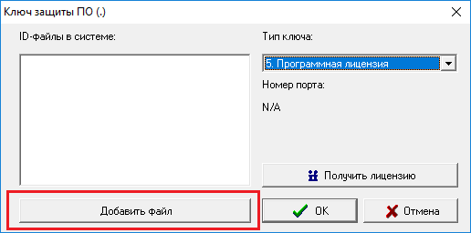 - В появившемся окне выбрать параметр «Тип ключа» - «5. Программная лицензия». Нажать на кнопку «Добавить файл».