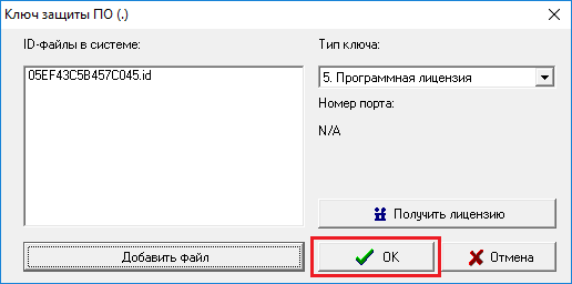 - В пункте меню «Ключ защиты» убедиться, что в поле «ID -файлы в системе» появился добавленный файл и нажать кнопку «ОК».