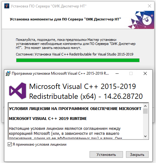 При установке Visual C++ Redistributable for Visual Studio 2015-2019 x64 откроется окно установщика, в котором необходимо ознакомиться и принять условия лицензионного соглашения, после от имени администратора необходимо подтвердить установку компонента.