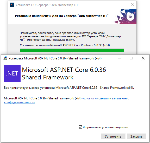 При установке Microsoft ASP.NET - 6.0.36 x64 откроется окно установщика, в котором от имени администратора необходимо подтвердить установку компонента.