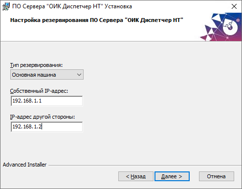 После выбора каталогов установки, будет предложено произвести настройки резервирования. Если настраиваемый комплекс состоит из двух компьютеров (основного и резервного), то настройки резервирования следует выполнить в момент установки с помощью появившегося окна.