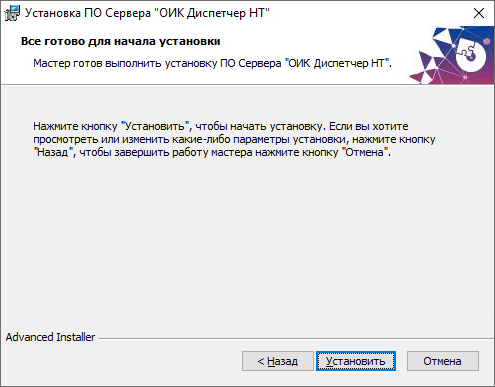 После окна настройки ключа защиты, все будет готово к установке ПО «ОИК Диспетчер НТ». Запуск процедуры установки осуществляется с помощью кнопки «Установить»