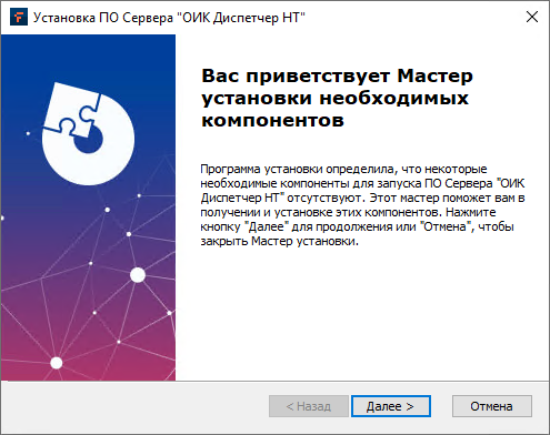 Если необходимые компоненты не установлены и не обнаружены на используемом компьютере, то после запуска файла OikServer_vX.X(YY_MM_DD).exe откроется окно, представленное на снимке экрана ниже, если необходимые компоненты обнаружены - будет открыто окно установки ПО сервера «ОИК Диспетчер НТ».
