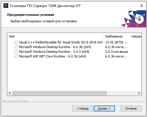 После успешной установки необходимых компонентов (если их установка потребуется) открывается окно установки ПО сервера «ОИК Диспетчер НТ».