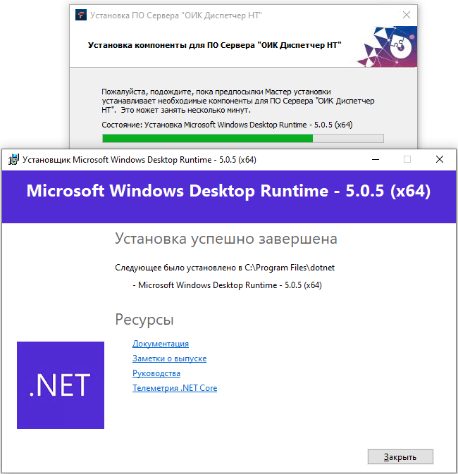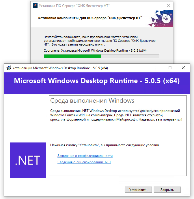 Нажав кнопку «Далее» начнется процедура установки необходимых компонентов. При установке Microsoft Windows Desktop Runtime - 5.0.5 x64 откроется окно установщика, в котором от имени администратора необходимо подтвердить установку компонента.