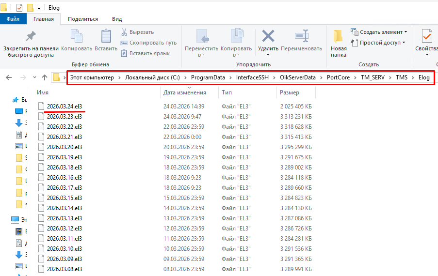 Для ОС Windows C:\ProgramData\InterfaceSSH\OikServerData\PortCore\TM_SERV\TMS\Elog