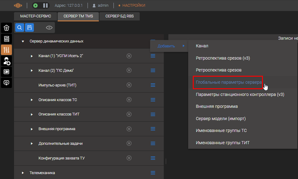 Настройки размера журнала событий доступны в глобальных параметрах сервера. Для настройки необходимо открыть страницу меню "Настройка" выбрать пункт "Сервер динамических данных" нажать кнопку и добавить "Глобальные параметры сервера"