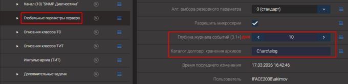 В строке глубина журнала событий (3.1+) указывается количество дней за которое будут записываться файлы журнала событий, при превышении настроенного в глобальных параметрах сервера ограничения, переносятся в каталог долговременного хранения.