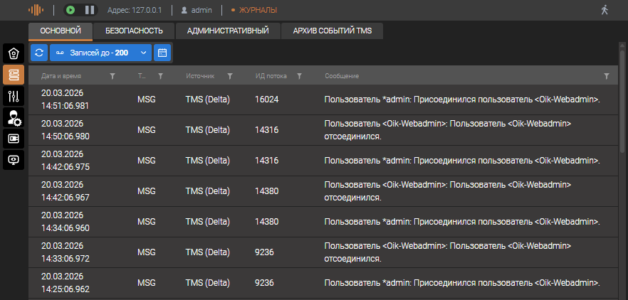 Журнал регистрации событий (вкладка "Основной") - является диагностическим журналом работы всего комплекса. В него попадают сообщения о старте ПО, установки соединения с источниками телеметрии, сообщения об ошибках в работе ПО и другие диагностические сообщения. Размер данного журнала по умолчанию равен 512 мб, что позволяет записать около тысячи сообщений. При необходимости размер журнала может быть увеличен в пункте настройки, на уровне Мастер-сервиса.