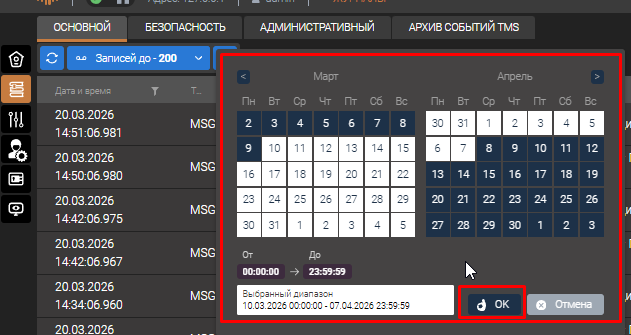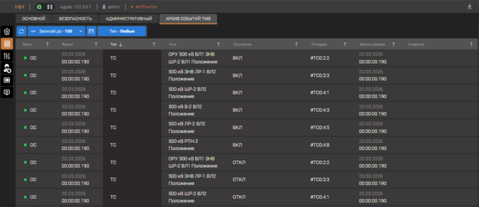 Архив событий TMS - отображение архива событий, которые создаются после изменения состояния телесигналов, выхода за уставки значения телеизмерений, взведения аварийно-предупредительной сигнализации. Предназначен для диагностики работы функционала записи событий и представляет упрощенный вариант просмотра. Основным инструментов просмотра событий является мониторинг событий в ПО Клиент10