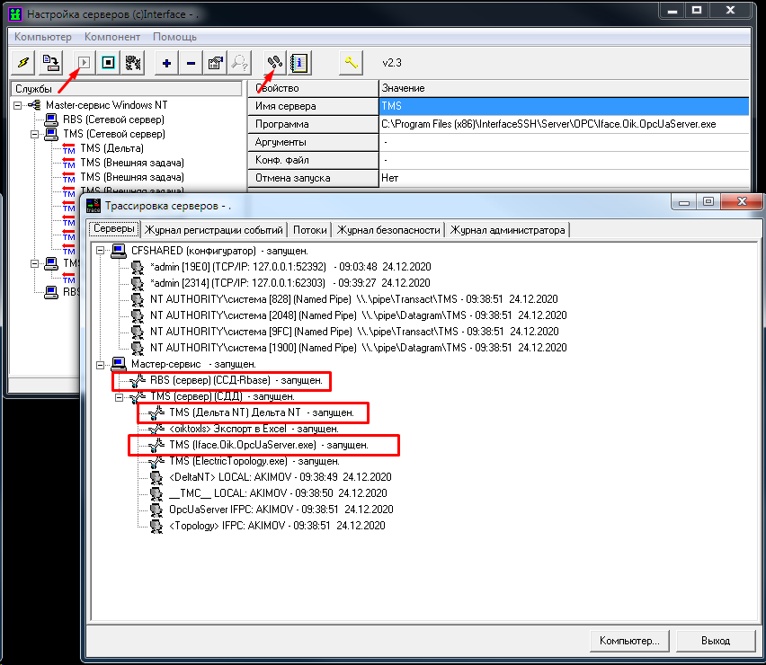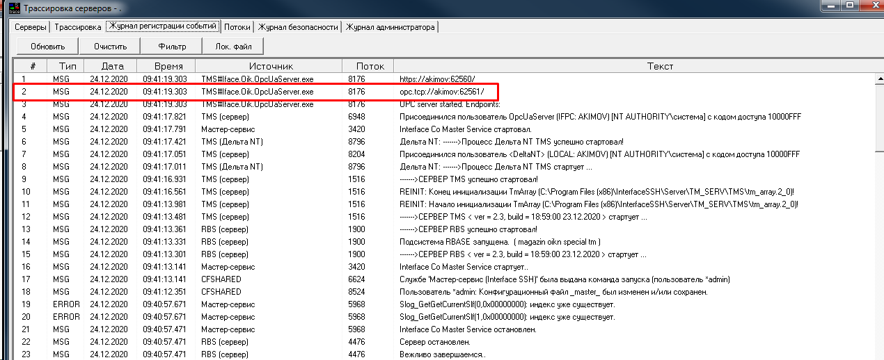 В журнале регистрации событий будет запись с реквизитами, по которым можно удаленно подключиться к службе OPC.